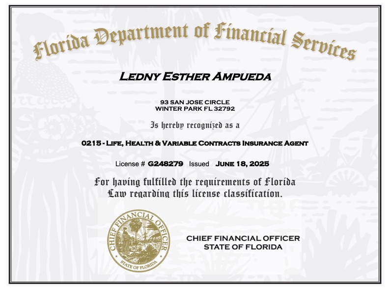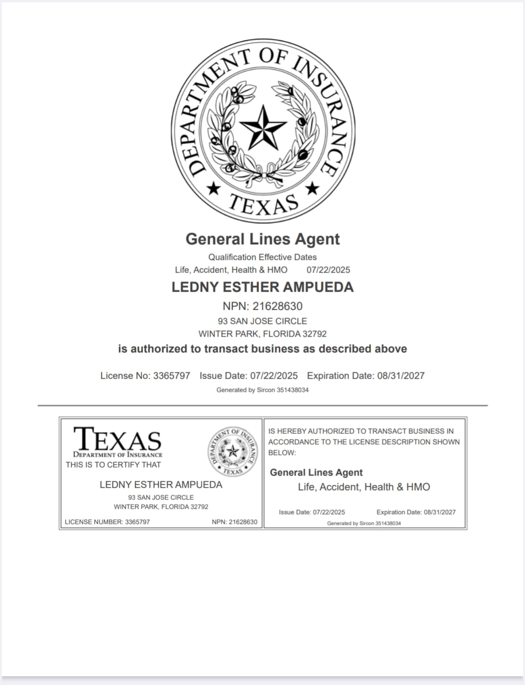 Soy un agente de seguros licenciado en más de 10 estados de los Estados Unidos, cumpliendo con todos los requisitos y regulaciones tanto a nivel estatal como federal.